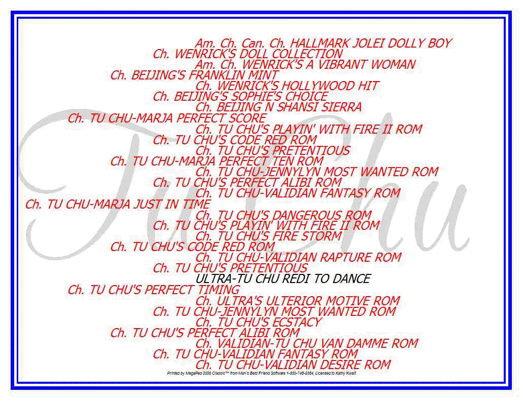 Pedigree for Ch. Tu Chu-MARJA Just in Time
